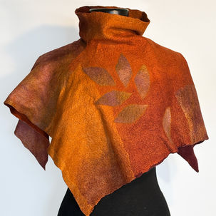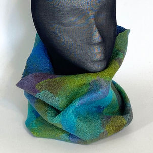 These lovely cowls can add a touch of color to your outfits and add a bit of warmth on cool days. Made with the Nuno Felt process combining wool with silk and other natural fibers.
